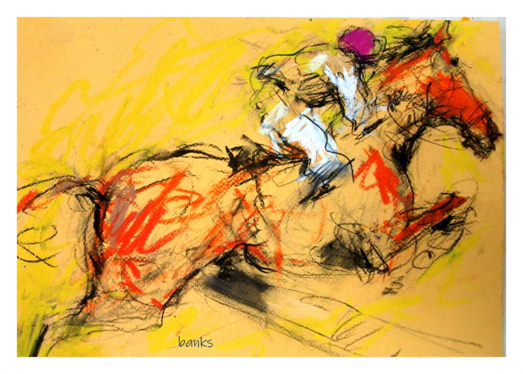 About Alasdair: Alasdair Banks was born in Edinburgh, Scotland, and studied drawing and painting at Edinburgh College of Art. He went on to work in arts management, part-time lecturing, and exhibition curation. During this period, he began creating large charcoal and pastel works focused on sporting events, particularly equine sport. His dynamic, energetic style stood apart in a field often defined by photo-realism. A collaboration with Olympia International Show Jumping in 2000 led to a series of prestigious residencies that centered on public engagement. Working in front of audiences became a defining part of his artistic practice and ultimately inspired the creation of Fine Art Live, which has since been featured at major events including Badminton, Hickstead, and Chatsworth. A three-year association with Lloyds Banking Group followed, featuring live events at venues including the Savoy, the Museum of Wales, and the Edinburgh Festival. He later undertook residencies at Glorious Goodwood and the Festival of Speed, producing large-scale outdoor works under public observation. Recent partnerships with Aston Martin, Volvo, and Lotus have expanded his motorsport profile, and he is currently the resident artist with the Jim Clark Trust. He is an associate member of the Society of Equestrian Artists.