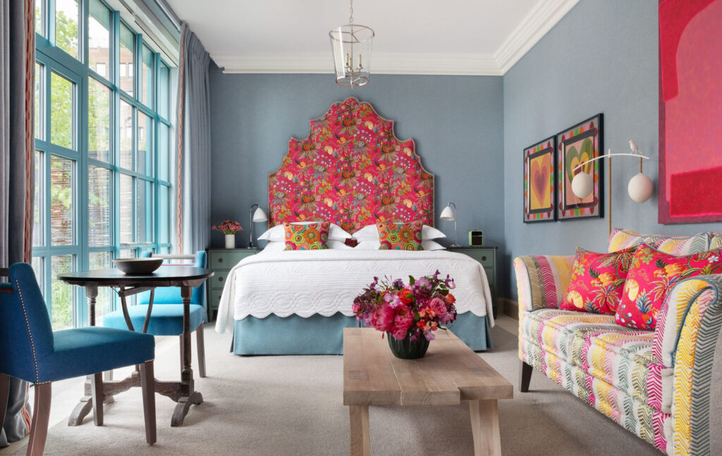 Kit Kemp properties are known for distinctive design, a celebration of color, individuality, and an elaborate blend of fabrics, artwork, and furnishings that feel both welcoming and perfectly balanced. While the result appears effortless, creating the intriguing environments is far from happenstance. “We can be bold, but it has to feel calm and not hectic,” says Willow. “That’s not easy, but that’s the joy of it.” Kit, the creative director for all Firmdale properties, reviews every scheme before it’s implemented in a room. The plans include everything from furniture layout to cornices, paint details, fabric, lighting, and more. If the team can’t find the right pattern or piece, they’ll design it.